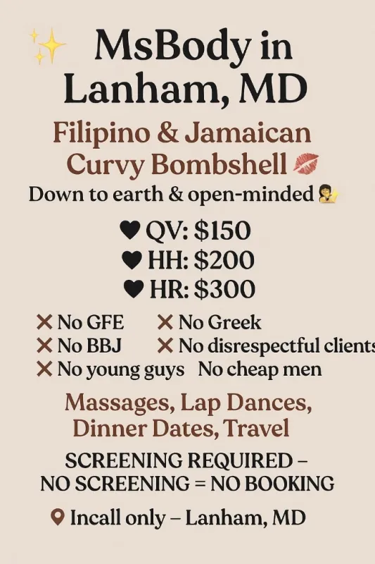 π MsBody β Lanham, MDπ β¨ Filipino & Jamaican Curvy Bombshell | Age 32 β¨ Escape with a down-to-earth, open-minded beauty ππ who knows how to keep you relaxed and entertained. Whether you want a sensual massageππ½β, a steamy lap danceππ½, or just someone to vibe with β Iβm your curvy companionβππ. πβ Massages π½ Dinner Dates π Lap Dances β Travel Available π΅ Rates: $150 β Quick visit $200-half hr $300 β hour β No Negotiations π« No young guys π« No disrespectful clients π« No cheap men β Screening is required to book β no screening = no booking .β¨ I reserve the right to decline any client Iβm not comfortable with. Cleanliness, manners, and good vibes only. Letβs enjoy an experience thatβs unforgettable, drama-free, and all about pleasure. π