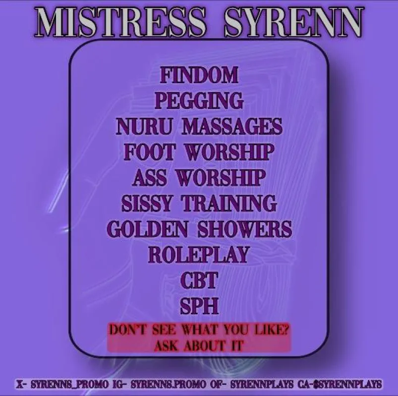 Surrender to the power of Mistress Syrenn 🖤 an elite 💎 and experienced dominatrix ⛓ who commands absolute obedience 🐶 I specialize in breaking limits⛓💥 shaping devotion 🙇🏼 and molding 👙 subs I only accept dedicated clients- so if you seek to serve, be prepared to prove your worth 🤑🔐 Sessions are professional 🤓 discreet 🤫 & strictly within negotiated boundaries 🚦 Are you ready to serve Tribute required. Serious inquiries only. Contact me via contact info on my ad or X- SyrennsPromo