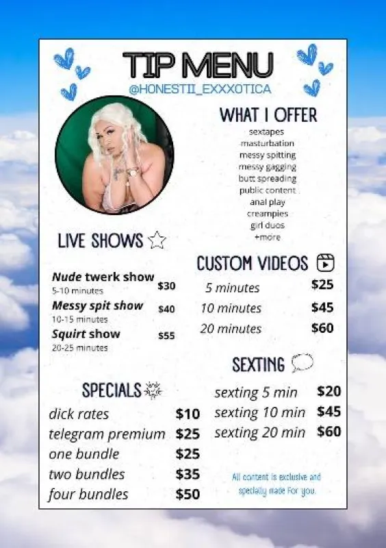 I'm Not🛑 Doing MEETS At The Moment I Am Currently Only Offering XXX Freaky Facetimes 📲💦 Exxtra Spicy Videos And Fetishes 💦💦 How Do You Wanna Get Nasty SUBSCRIBE TO MY ONLYFANS 🫣 Follow My Insta🍒 Cum See My N Naughty Side ⬇ 🫦 SUBSCRIBE TO MY ONLYFANS 🫣 🔗 LINKS https://onlyfans.com/honestii_exxxotica Twitter @downsouthvixiin Ft shows, Sexting, Feet Fetishes , B/G Content , Customs & More! Ask For My Content Menu Love💋 ✨ IG:honesti_exxotica TWITTER :@downsouthvixiin Telegram : t.me/honestiexxxotica I LIVE VERIFY